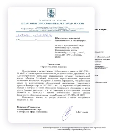 образовательное учреждение, получившее образовательную лицензию № 041426 от «25» мая 2021 выданную департаментом образования и науки города Москвы